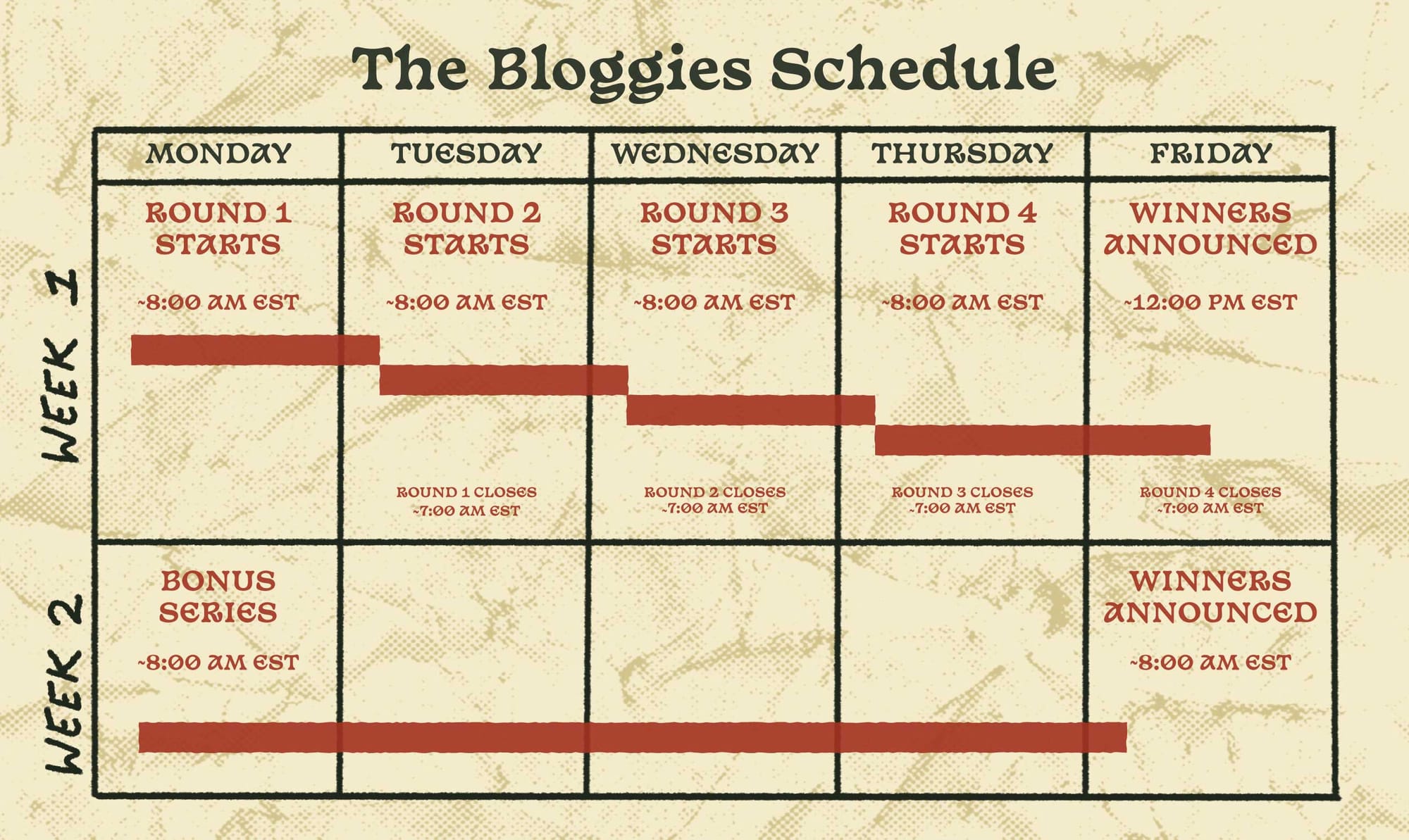 The Bloggies' schedule is always in flux. This year, the plan is to run all five category tournaments in just one week. We're not saying you should take time off, but maybe be prepared to read a lot. The following week will be voting for Best Series and Best Debut Blog.