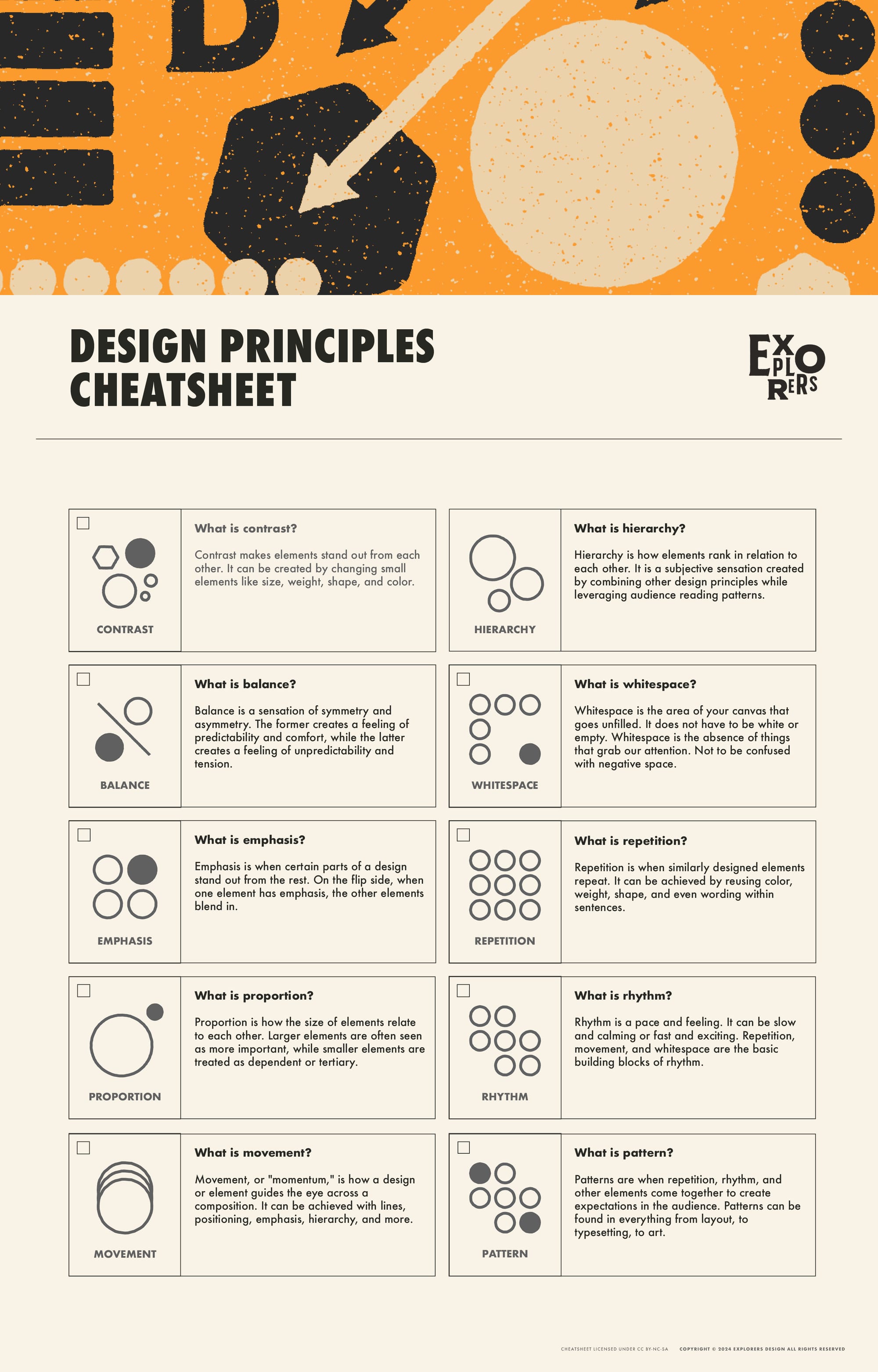 Design principles are like designer vocab. If you know them, you can talk about them (and learn from them). This particular cheatsheet summarizes the Explorers' version. It's been distilled from textbooks, classes, and websites.