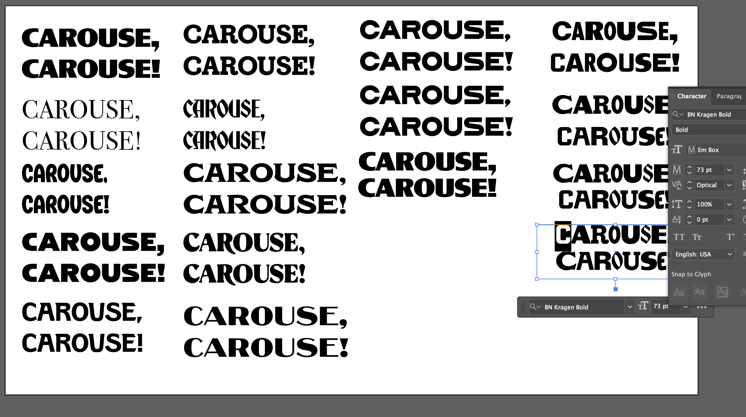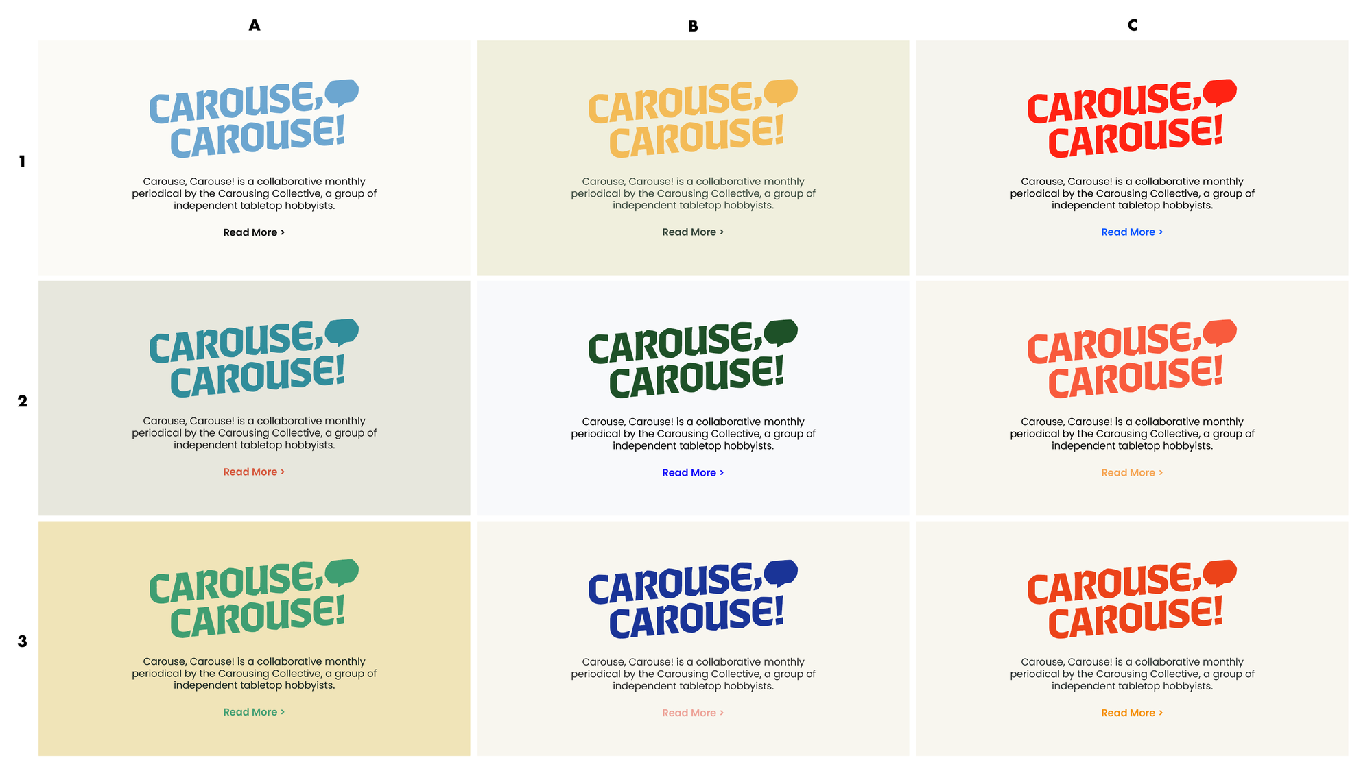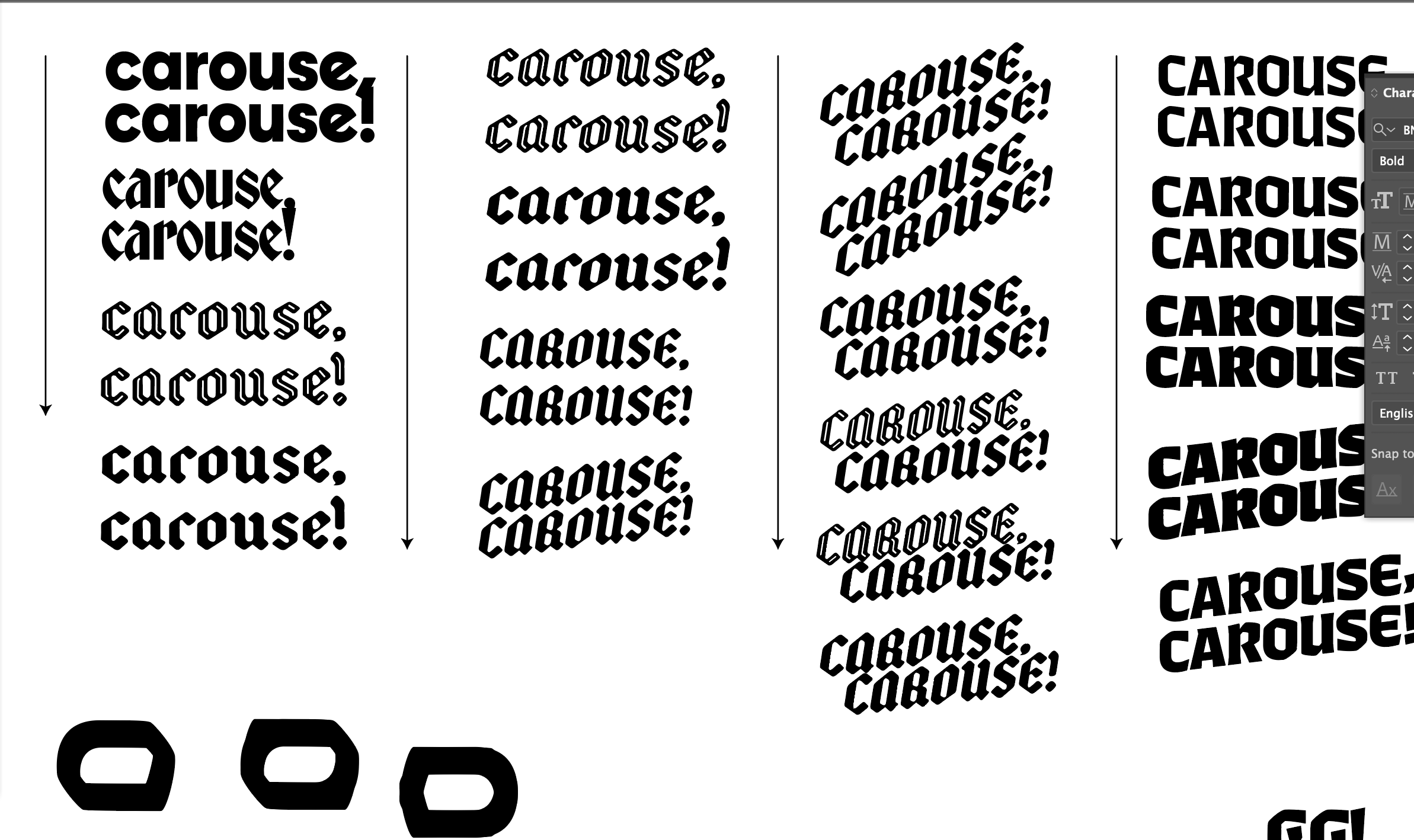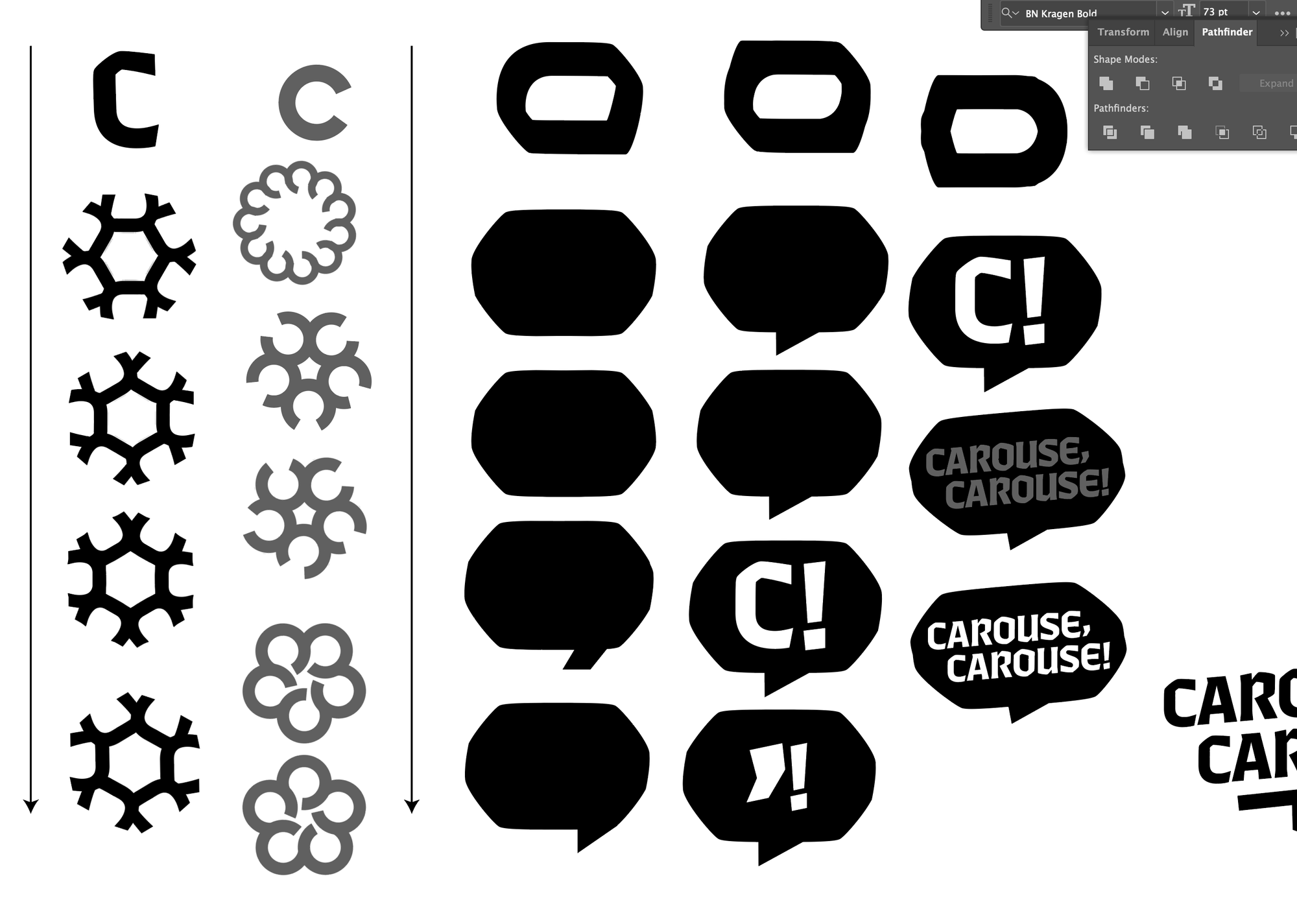 Logo iterations (clockwis from top left): Carouse in Nickerson fonts, Carouse Blackletter, Bubbles and "C" gatherings, Comma and Exclamation pairings.