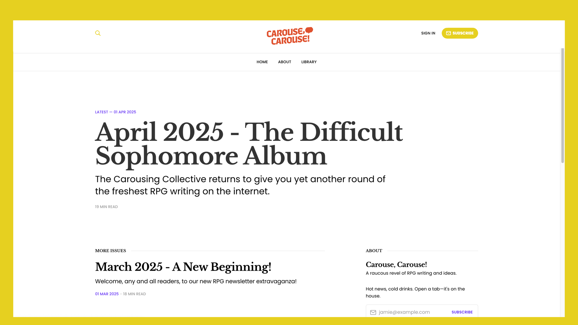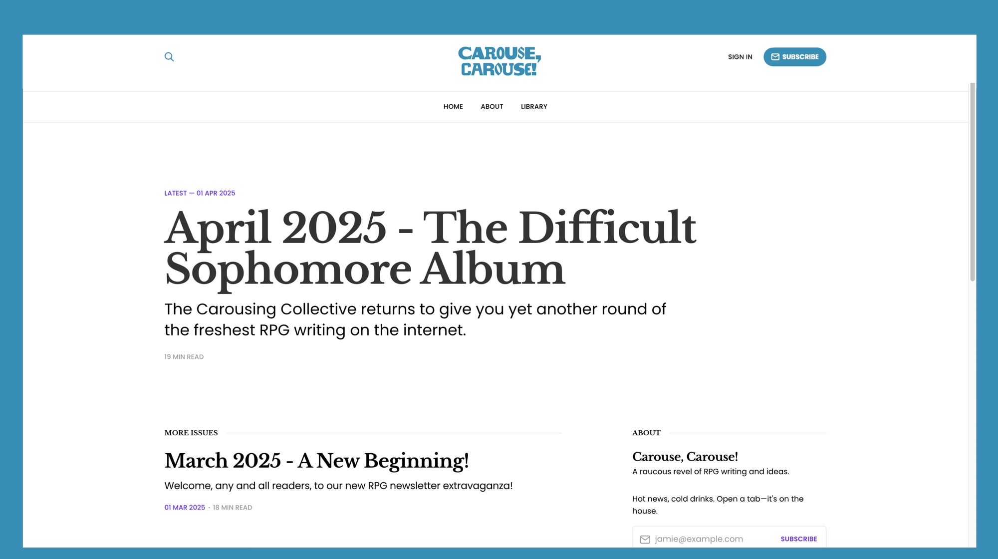 If you've worked in branding, you know what a positioning statement is. It's a one-line description that declares how the brand is different. My approach is to say something unexpected right away. Don't bother with the, "Carouse is an indie newsletter packed with fun ideas and gameable material." That's not differentiating (even if it says it is). I want an analogy or counter intuitive statement that defies expectations. Something that will continue to differentiate even when other newsletters are "packed with fun ideas."