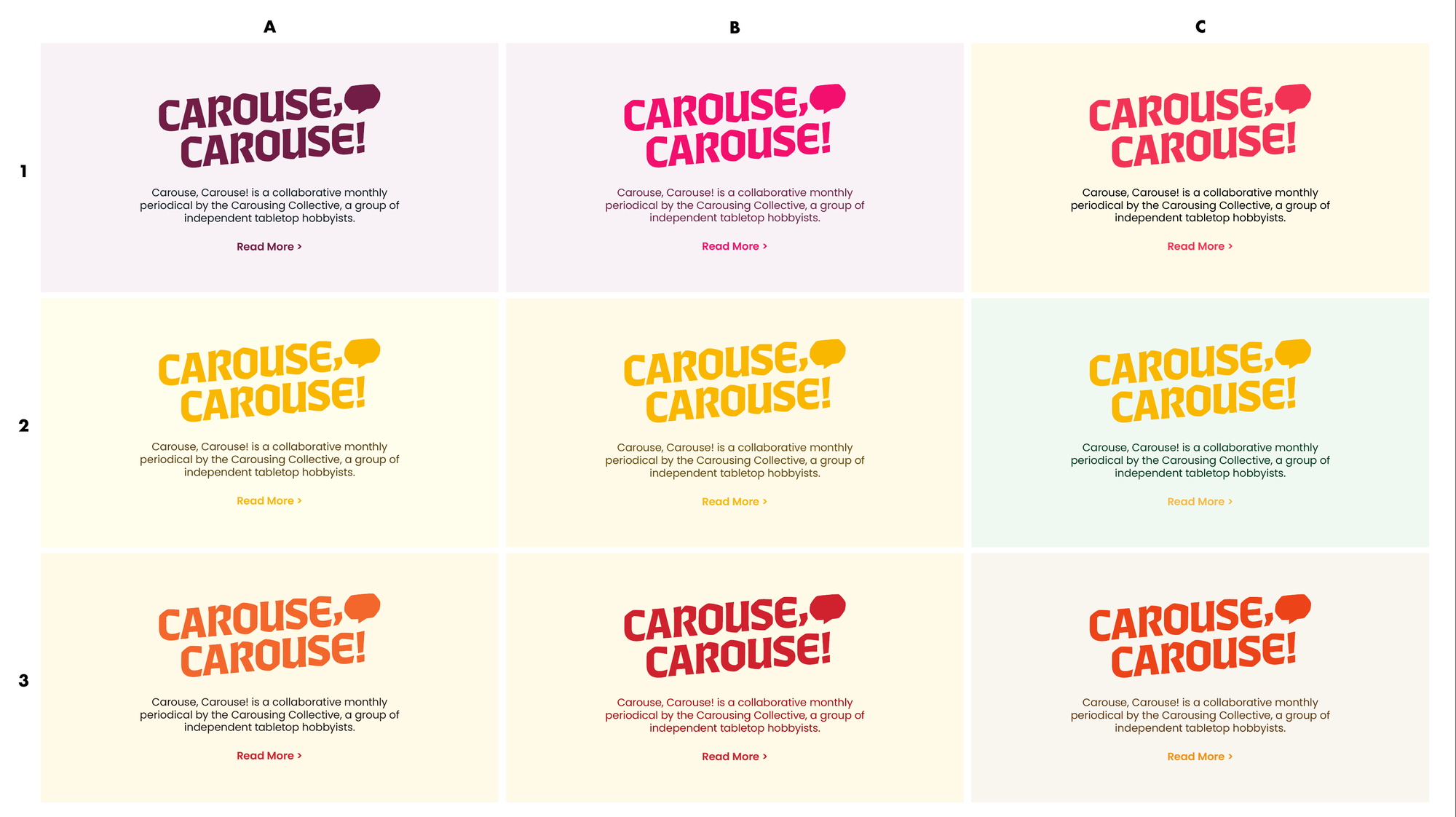 This is where I get into my flow state. I have everything I need: strategy, ideas, and disparate design elements. Now I need to combine them, refine them, tweak them, and repeat until I'm sick of it. For the Carouse crew, I'm going to try and show them two rough concepts. Rough in this instance means finished-looking but imperfect—colors, kerning, and all of the fine details will be off. The point of the concepts is to convey the overall idea.