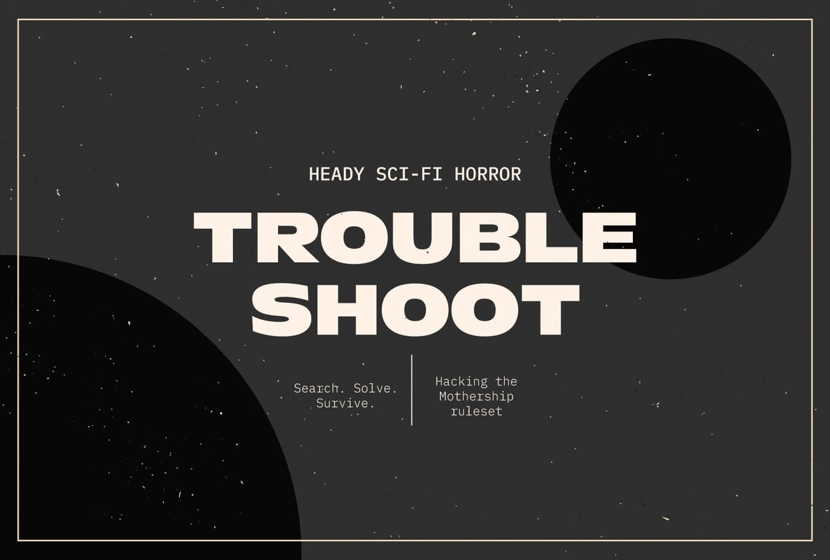 In the wise words of Quinn from 200-Proof Games, "Done is a myth. Complete is a joke. Perfect is impossible." This article is my sneaky ashcan release of a Mothership demake and Traveller reboot—Troubleshoot. It scrapes all the knick knacks off Mothership's hull until there's nothing left but the warp drive. Expect a Troubleshoot 0E in the year 2025 CE.