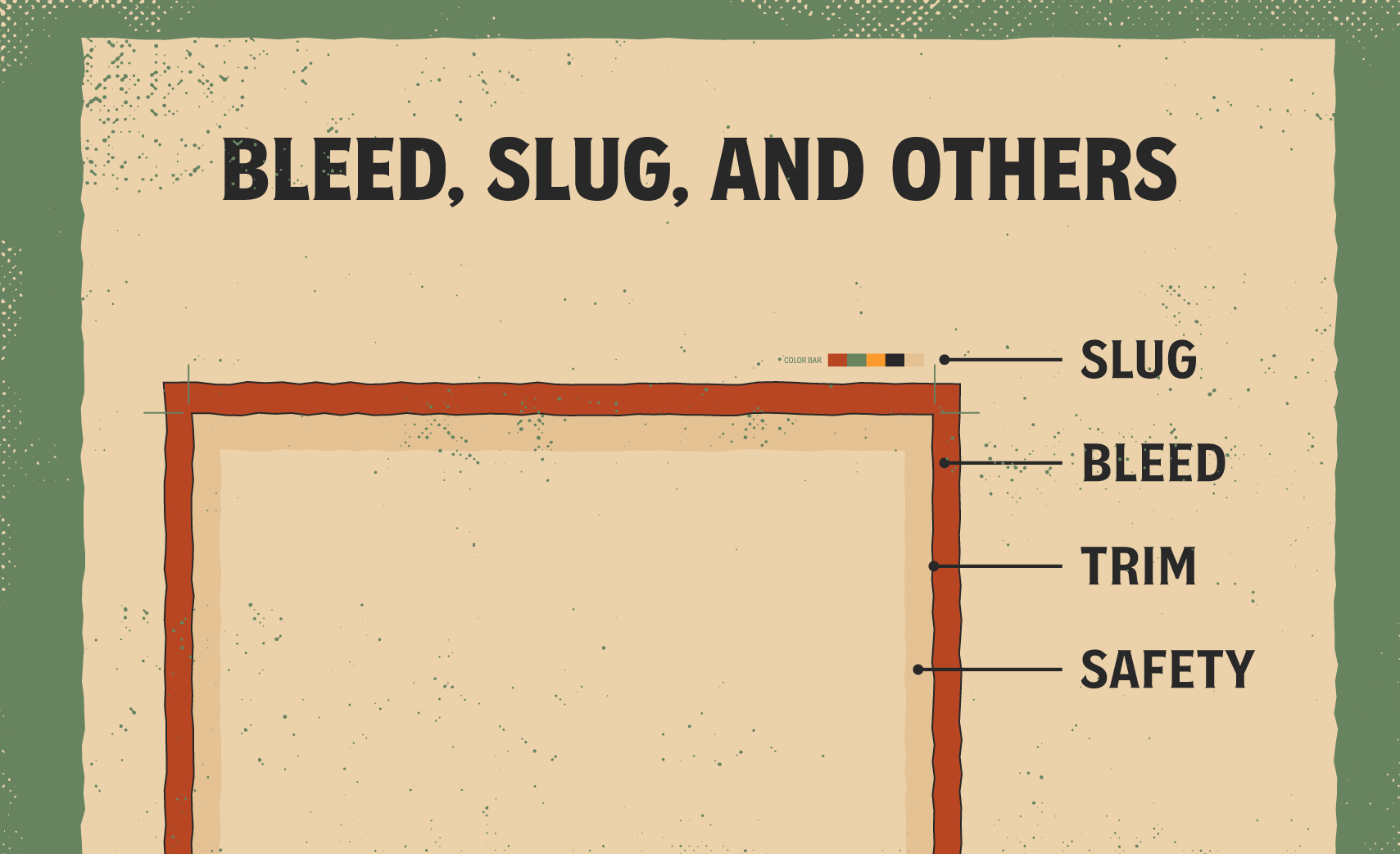 Most graphic designers and working professionals (that I know) have never needed to touch the slug. It's the space beyond trim and bleed that doesn't get printed. It's where information or notes for the printer live. Most of the time, it houses little markings for alignment, trimming, and color calibration. In really complex jobs, it might even include notes for premium treatments—like embossing, spot-ink, etc.